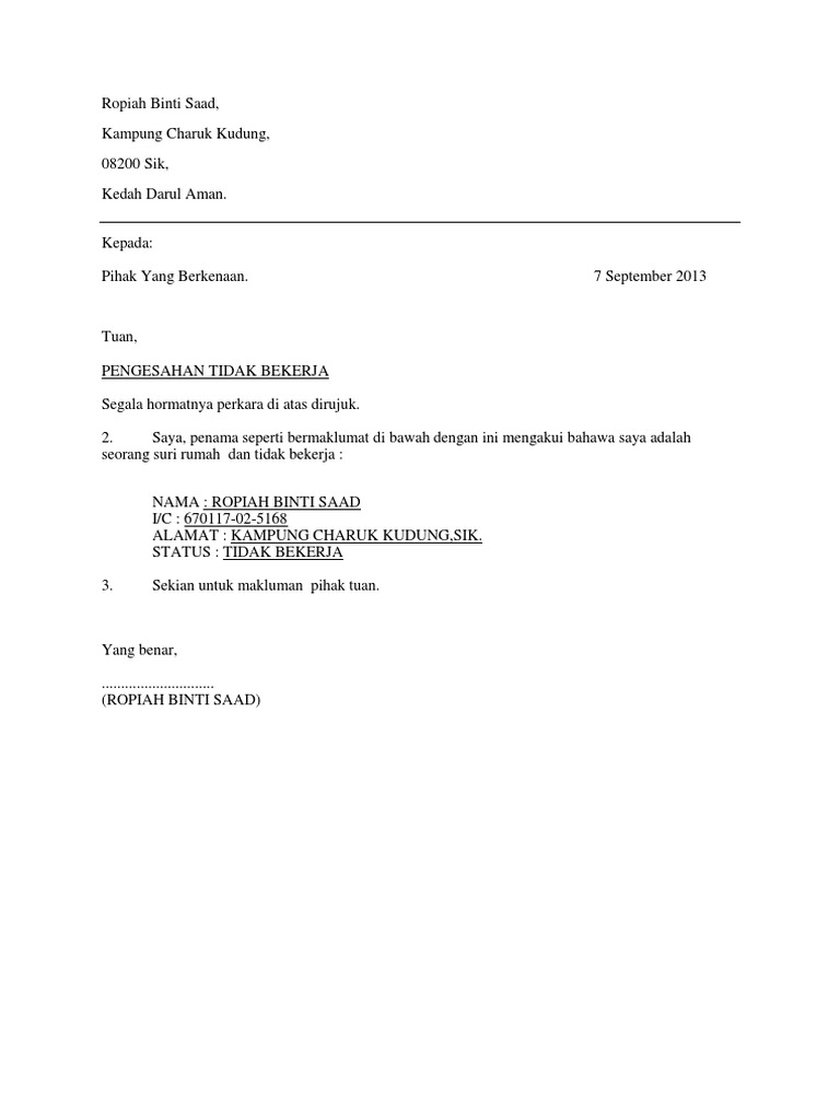 Text of surat pengesahan tidak bekerja. Contoh surat izin tidak masuk kerja pns yang baik dan benar. Surat akuan pengesahan pendapatan adalah khusus buat individu yang bekerja sendiri dan tidak mempunyai slip gaji. Jangan lupa untuk membubuhi tanda tangan dan cap resmi milik perusahaan. Surat pengesahan pendapatan ibu bapa tidak. Dengan segala hormatnya merujuk perkara di atas. Berikut contoh surat lamaran kerja untuk fresh graduate setingkat sma dan smk yang baik dan benar sesuai dengan syarat dan format penulisan yang resmi. Namun, tidak semua pemohon bekerja dengan majikan dan mempunyai slip gaji. Merujuk perkara di atas, adalah. Contoh surat pengantar saja pada saat ini memang sangat dibutuhkan, karena surat pengantar termasuk contoh dari surat resmi. Surat pengesahan pekerja mat bin ali abc sdn bhd, 06000 alor setar, kedah darul aman no. Contoh surat pengalaman kerja adalah surat yang dikeluarkan oleh suatu instansi atau perusahaan tertentu yang isinya menerangkan bahwa seseorang pernah bekerja pada instansi atau perusahaan tersebut dalam satu periode kerja tertentu. Sebagai bukti pernah bekerja, tidak cukup hanya dengan.